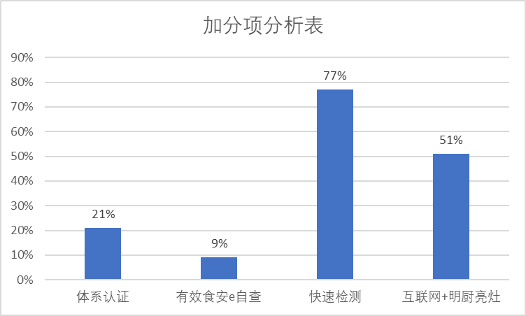 为激励各企业采用先辈的体例或办理东西对食物平安进行管控,本次审核设立四项加分项,别离为采用食物平安系统办理、利用食安e自查、实施快速检测、落实互联网+明厨亮灶。